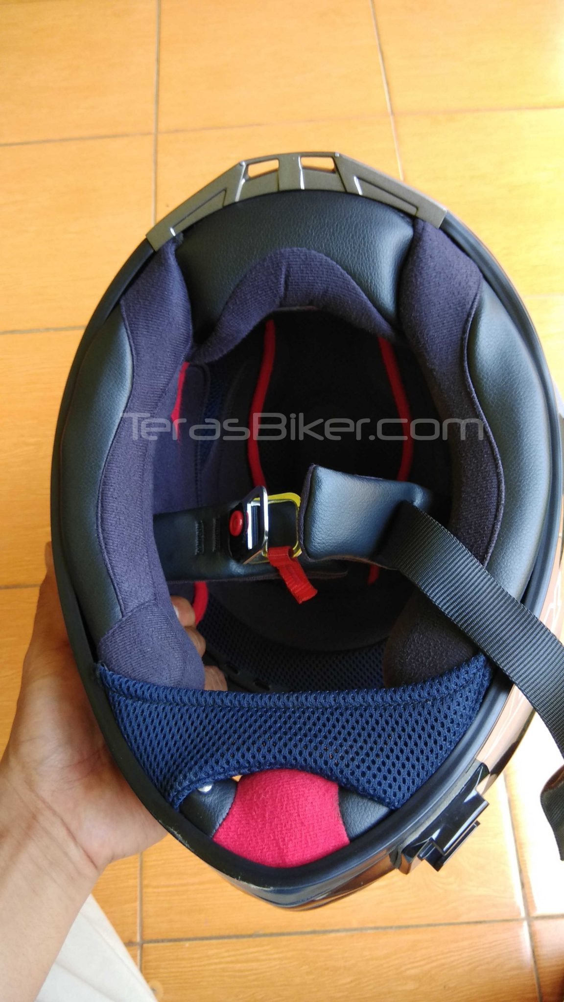 Untuk bagian exterior, pada bagian kaca utama atau Visor helmnya telah dilengkapi fitur Scratch Resistance untuk menghindari goresan yang mungkin bisa terjadi karena kotoran baik pasir yang menempel atau lainnya klo karena jatuh dan kegaruk aspal ya itu sih untung-utungan ya sob… bisa jadi malah ganti visor baru heheheh…, ada juga UV Protection, visor lock, dan yang terpenting adalah kekuatan visor tidak akan pecah jika tertimpa beban/ benda dengan berat 3 Kg (Impact Resistance). Kemudian untuk ventilasi atau kisi-kisi udara ada empat titik, dibagian depan dekat dagu, atas kiri dan kanan, serta dibagian belakang Sob’.. Kisi-kisi tersebuat cukup berfungsi ketika riding dikecepatan 60 km/jam udara banyak masuk dan bagian kepala jadi berasa adem sob’…
