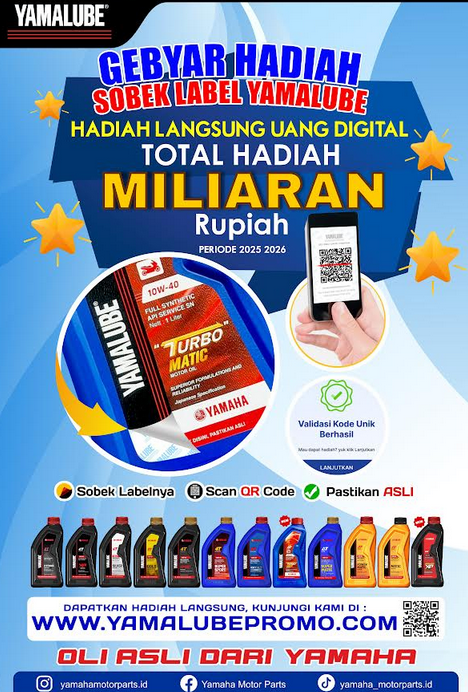 Yamalube asli dan ikuti program “Gebyar Hadiah Sobek Label Yamalube”. Untuk informasi lebih lanjut terkait aktivitas, kunjungi website resmi program promo berikut ini www.yamalubepromo.com.