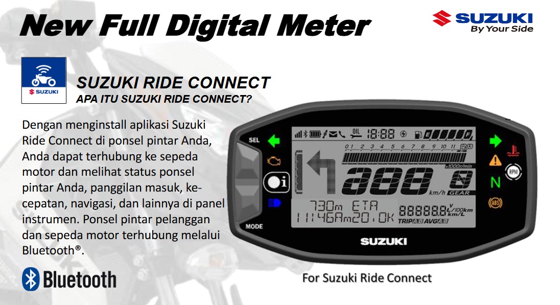 Sorotan utama terdapat pada teknologi Suzuki Ride Connect, yang merupakan penggunaan aplikasi penghubung informasi antara smartphone dengan speedometer cluster pada unit Satria PRO milik pelanggan. Perangkat lunak resmi dari Suzuki ini bisa menampilkan lokasi parkir kendaraan, catatan perjalanan, konsumsi bahan bakar periodik, hingga pengingat jadwal perawatan.