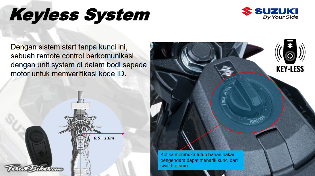 Keamanan Satria PRO turut ditunjang oleh perangkat Key-less Ignition. Melalui kecanggihan ini, pengendara cukup mengantongi remote smart key dan dapat langsung menyalakan mesin ataupun mengunci kemudi tanpa menggunakan anak kunci.