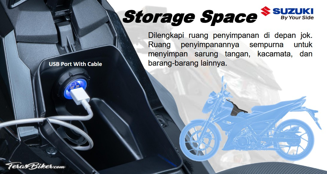 Sebagai penunjang mobilitas pengguna, Satria PRO telah disertai USB outlet dengan ruang kompartemen penyimpanan 961 ml yang cukup untuk menyimpan kebutuhan utama. Pengoperasian buka-tutupnya pun mudah melalui tuas key-less yang berada di atasnya.