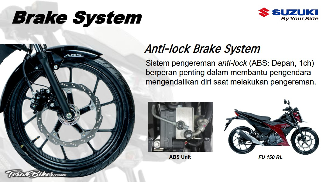 Guna meningkatkan segi keselamatan, Suzuki telah menambahkan Antilock Brake System (ABS) pada roda depan. Sistem ini akan membantu pengendara memiliki kontrol lebih terhadap kendaraan saat melakukan pengereman mendadak. Roda tidak akan mengunci dan tetap mendapatkan traksi, sehingga meminimalisir terjadinya kecelakaan.