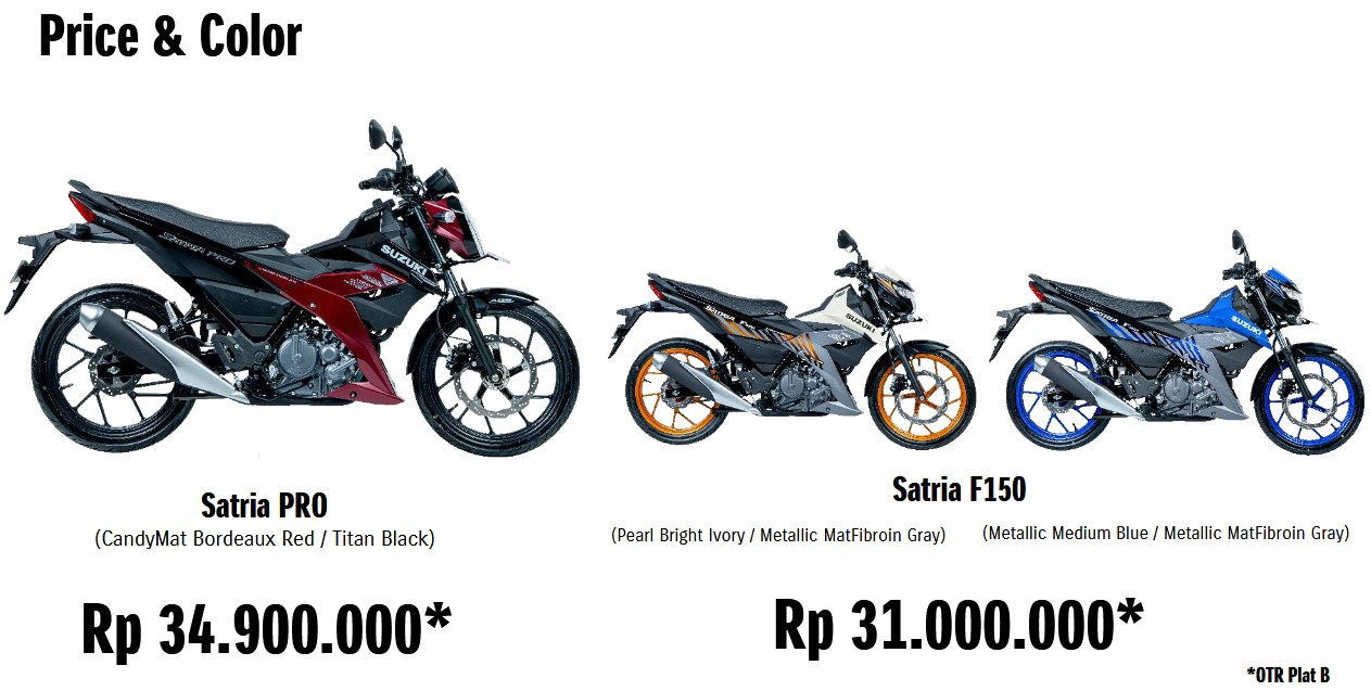 Menggunakan strategi pendekatan berbeda, Suzuki menawarkan Satria F150 dengan harga lebih kompetitif, yaitu Rp 31.000.000, – (on the road DKI Jakarta). Calon konsumen bisa memilih 2 opsi warna dinamis, antara lain Pearl Bright Ivory/Metallic MatFibroin Gray atau Metallic Medium Blue/ Metallic MatFibroin Gray.