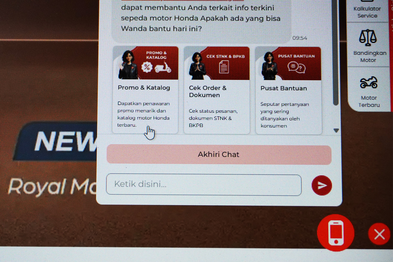 Melalui fitur di asisten virtual Wanda, konsumen dapat dengan mudah menyesuaikan pilihan sepeda motor Honda dengan kebutuhan penggunaan, baik untuk kendaraan harian, keperluan kerja, hobi, maupun kebutuhan mobilitas lainnya. Dengan informasi yang lengkap dan akurat, konsumen diharapkan dapat mengambil keputusan pembelian dengan lebih percaya diri.